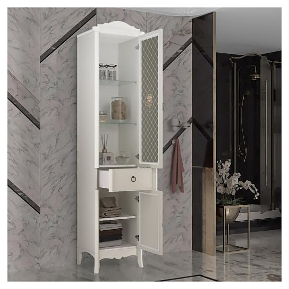 Шкаф-пенал OPADIRIS Виктория Z0000012697 выполнен в классическом, лаконичном стиле и отлично дополнит интерьер любой ванной комнаты. Модель оснащена 2 распашными фасад-дверцами, за которыми находятся стеклянные полки, где удобно хранить необходимые в ванной комнате принадлежности и элементами декора, и небольшим выдвижным ящиком в центральной части пенала. Напольная конструкция обеспечивает легкий монтаж и не требует специального ремонта в помещении. Корпус изделия выполнен из массива бука, боковины - из ЛДСП. Пенал может использоваться в составе гарнитура для ванной комнаты Виктория 90, слоновая кость.
