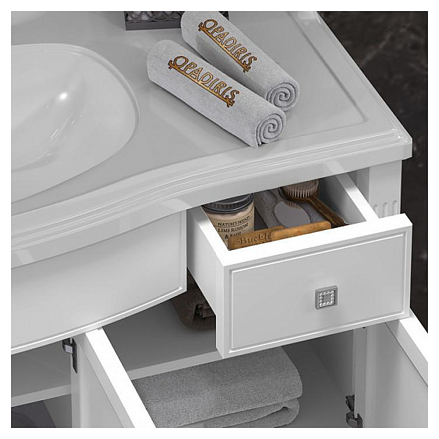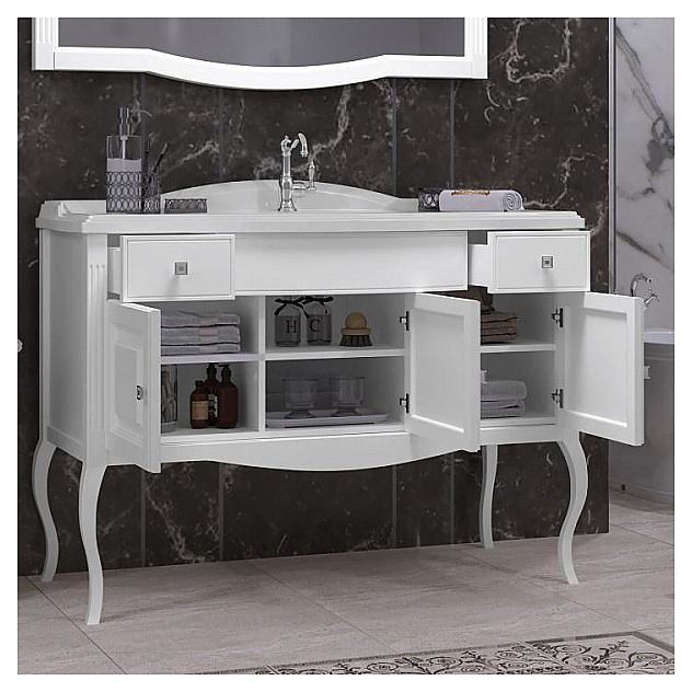 Тумба напольная под раковину OPADIRIS Лаура 120 Z0000012472 выполнена в классическом стиле. Модель оснащена 2 небольшими ящиками в верхней части изделия и 3 распашными фасад-дверцами. Напольная конструкция обеспечивает легкий монтаж и не требует специального ремонта в помещении. Благодаря изящной отделке и классическим формам мебель станет украшением любой ванной комнаты. Корпус изделия выполнен из массива бука, материал боковых сторон - МДФ. Тумба приобретается только в комплекте с раковиной Florentina Лаура 120 10.210.01200.001. Раковина со смесителем в комплект поставки не входят и приобретаются отдельно. Тумба является частью гарнитура для ванной комнаты Лаура 120, белый матовый / хром. Дополнительные характеристи:
