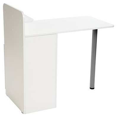 Маникюрный стол Имидж Мастер ОПТИМУМ ПЛЮС предназначен для обустройства рабочего пространства мастера маникюра в косметологических центрах, салонах красоты и домашних студиях ногтевого сервиса. Модель оснащена прямоугольной столешницей, цилиндрической опорой на подпятнике, встроенной тумбой с 1 открытой полкой и запираемым распашной дверцей отделением с 2 полками для хранения оборудования, аксессуаров и расходных материалов, а также надстольной открытой полочкой для лаков. Столешница, фасады и полки изготовлены из высококачественной ламинированной древесно-стружечной плиты с облицовкой влагостойкой пленкой, опора – из металла. Особенности: