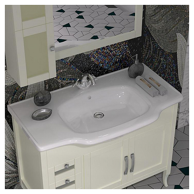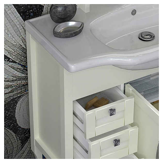Тумба напольная под раковину OPADIRIS Мираж 100 00-00000055 выполнена в классическом стиле. Модель оснащена 2 распашными фасад-дверцами, внутри которых находится полка и 3 небольшими ящиками полного выдвижения в левой части изделия, где удобно хранить необходимые в ванной комнате личные принадлежности, аксессуары и элементы декора. Напольная конструкция обеспечивает легкий монтаж и не требует специального ремонта в помещении. Благодаря изящной отделке и классическим формам мебель станет украшением любой ванной комнаты. Корпус изделия выполнен из массива бука и филенки МДФ со шпоном, материал боковых сторон - ЛДСП со шпоном. Тумба приобретается только в комплекте с раковиной Cerastyle Классик 100 081300-u-01 Раковина со смесителем в комплект поставки не входят и приобретаются отдельно. Тумба является частью гарнитура для ванной комнаты Мираж 100, слоновая кость. Дополнительные характеристики: