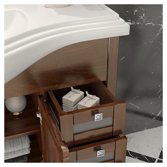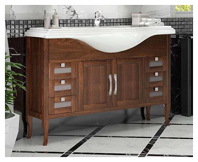 Тумба напольная под раковину OPADIRIS Мираж 120 00-00000058 выполнена в классическом стиле. Модель оснащена 2 распашными фасад-дверцами, внутри которых находится полка и 6 небольшими ящиками полного выдвижения, где удобно хранить необходимые в ванной комнате личные принадлежности, аксессуары и элементы декора. Напольная конструкция обеспечивает легкий монтаж и не требует специального ремонта в помещении. Благодаря изящной отделке и классическим формам мебель станет украшением любой ванной комнаты. Корпус изделия выполнен из массива бука и филенки МДФ со шпоном, материал боковых сторон - ЛДСП со шпоном. Тумба приобретается только в комплекте с раковиной KIROVIT Классик 1200 004000. Раковина со смесителем в комплект поставки не входят и приобретаются отдельно. Тумба является частью гарнитура для ванной комнаты Мираж 120, светлый орех. Дополнительные характеристики: