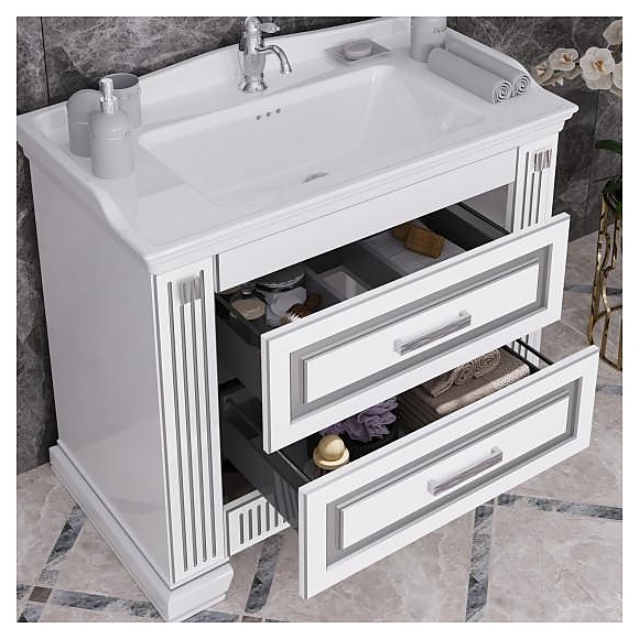 Тумба напольная под раковину OPADIRIS Оникс 100 00-00003527 выполнена в классическом стиле. Модель оснащена 2 глубокими ящиками полного выдвижения. Напольная конструкция обеспечивает легкий монтаж и не требует специального ремонта в помещении. Благодаря изящной отделке и классическим формам мебель станет украшением любой ванной комнаты. Корпус изделия выполнен из МДФ, материал боковых сторон - ЛДСП, раковина - фаянс. Тумба приобретается только в комплекте с раковиной Cerastyle Kapadokya 100 036500-u-01. Раковина со смесителем в комплект поставки не входят и приобретаются отдельно. Тумба является частью гарнитура для ванной комнаты Оникс 100, белый глянец / серебро. Дополнительные характеристи: