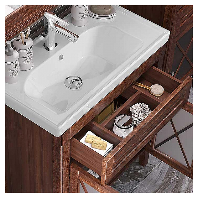 Тумба напольная под раковину OPADIRIS Палермо 80 00-00002354 выполнена в классическом стиле. Модель оснащена распашными фасад-дверцами и небольшим ящиком в верхней части изделия. Напольная конструкция обеспечивает легкий монтаж и не требует специального ремонта в помещении. Благодаря изящной отделке и классическим формам мебель станет украшением любой ванной комнаты. Корпус изделия выполнен из массива бука, материал боковых сторон - массив буква и ДСП со шпоном.. Тумба приобретается только в комплекте с раковиной Cerastyle Frame 80 031200-u. Раковина со смесителем в комплект поставки не входят и приобретаются отдельно. Тумба является частью гарнитура для ванной комнаты Палермо 80, светлый орех. Внимание! На фото тумба с раковиной и смесителем, которые в комплект поставки не входят и приобретаются отдельно.