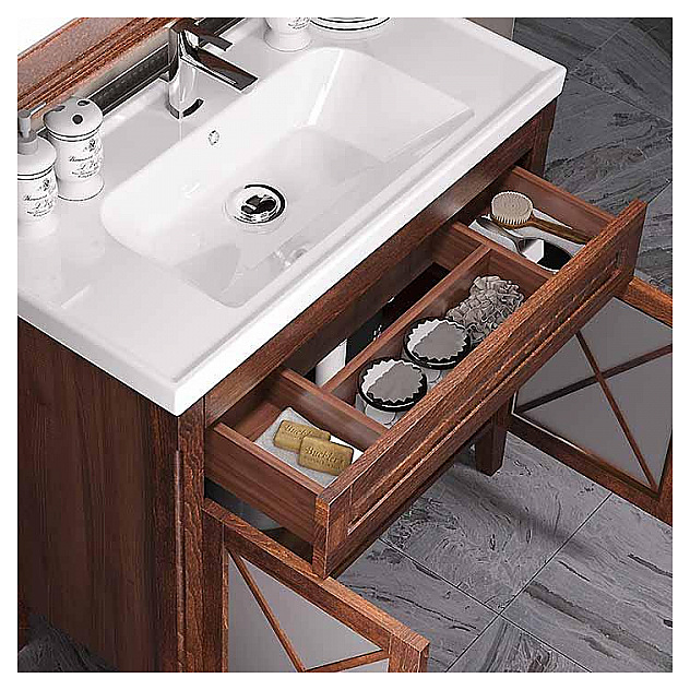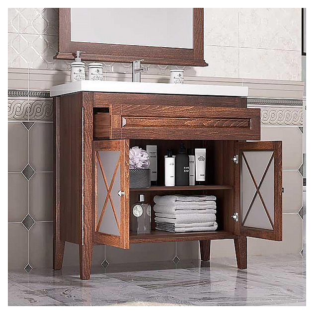 Тумба напольная под раковину OPADIRIS Палермо 90 00-00002356 выполнена в классическом стиле. Модель оснащена распашными фасад-дверцами и небольшим ящиком в верхней части изделия. Напольная конструкция обеспечивает легкий монтаж и не требует специального ремонта в помещении. Благодаря изящной отделке и классическим формам мебель станет украшением любой ванной комнаты. Корпус изделия выполнен из массива бука, материал боковых сторон - массив буква и ДСП со шпоном. Тумба приобретается только в комплекте с раковиной Cerastyle Frame 90 031300-u. Раковина со смесителем в комплект поставки не входят и приобретаются отдельно. Тумба является частью гарнитура для ванной комнаты Палермо 90, светлый орех. Внимание! На фото тумба с раковиной и смесителем, которые в комплект поставки не входят и приобретаются отдельно.