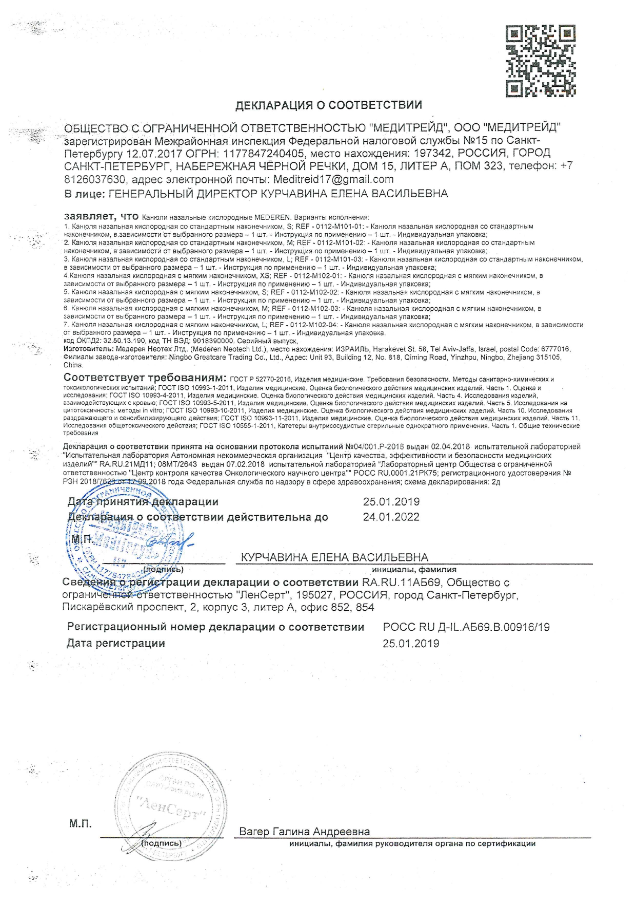 Канюля назальная кислородная MEDEREN со стандартным наконечником, размер L