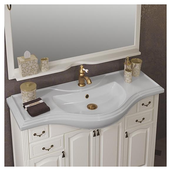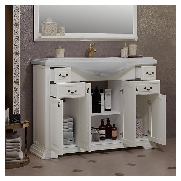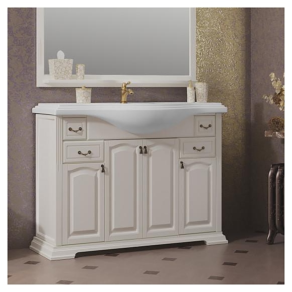 Тумба напольная под раковину OPADIRIS Риспекто 120 Z0000009687 выполнена в классическом стиле. Модель оснащена 4 распашными фасад-дверцами и 4 небольшими ящиками в верхней части изделия. Напольная конструкция обеспечивает легкий монтаж и не требует специального ремонта в помещении. Благодаря изящной отделке и классическим формам мебель станет украшением любой ванной комнаты. Корпус изделия выполнен из массива бука, материал боковых сторон - массив буква и филенка МДФ. Тумба приобретается только в комплекте с раковиной KIROVIT Классик 1200 004000. Раковина со смесителем в комплект поставки не входят и приобретаются отдельно. Тумба является частью гарнитура для ванной комнаты Риспекто 120, слоновая кость. Внимание! На фото тумба с раковиной и смесителем, которые в комплект поставки не входят и приобретаются отдельно.