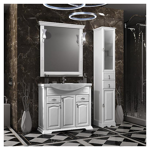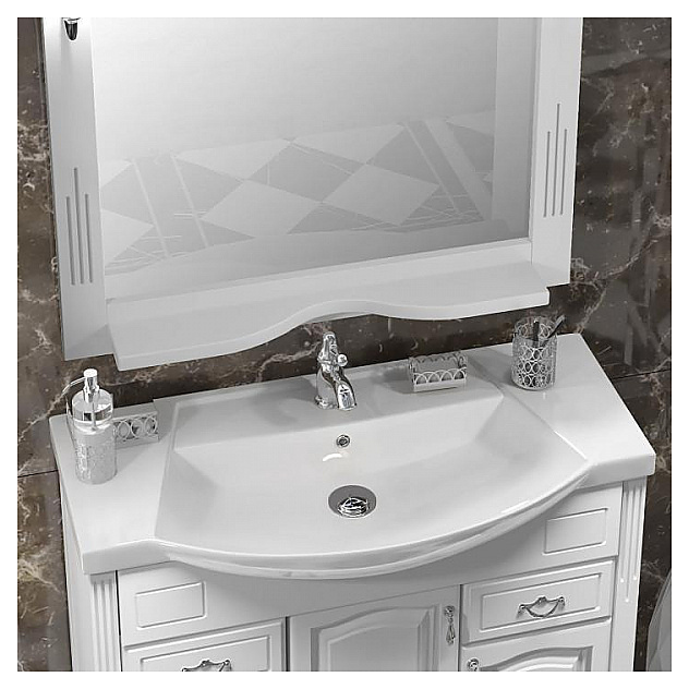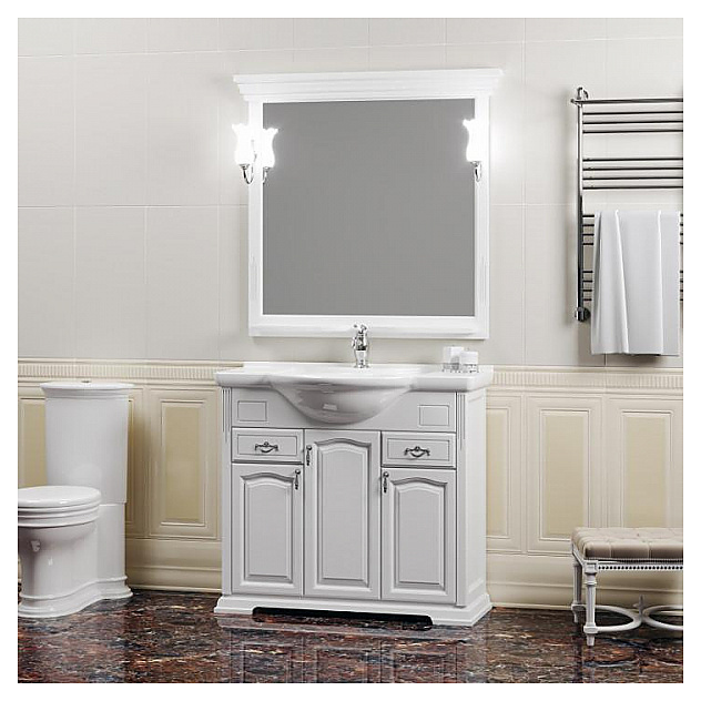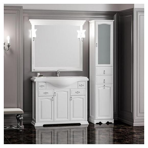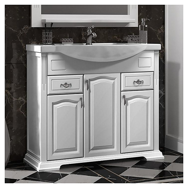Гарнитур OPADIRIS Риспекто 95 выполнен в классическом стиле. Тумба оснащена 3 распашными фасад-дверцами и 2 выдвижными ящиками, раковина имеет слив-перелив и одно отверстие для смесителя, расположенное по центру. Напольная конструкция обеспечивает легкий монтаж и не требует специального ремонта в помещении. Благодаря изящной отделке и классическим формам мебель станет украшением любой ванной комнаты. Корпус изделий выполнен из массива бука, материал боковых сторон - массив буква и филенка МДФ Комплектация: