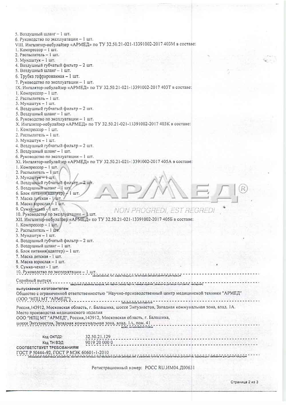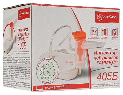 Ингалятор-небулайзер Армед 405Б используется в домашних условиях, медицинских и лечебно-профилактических учреждениях для проведения аэрозольных ингаляций с лекарственными препаратами при профилактике и лечении бронхиальной астмы, обструктивного бронхита, острых респираторных инфекций и других заболеваний дыхательных путей. Модель оснащена одноцилиндровым поршневым насосом, воздушным фильтром и кнопкой выключателя. Корпус изготовлен из ударопрочного АБС-пластика, маски и воздушный шланг – из поливинилхлорида, элементы распылителя – из полипропилена. В комплект поставки входят оральный мундштук и 2 маски для разных возрастов. Особенности: