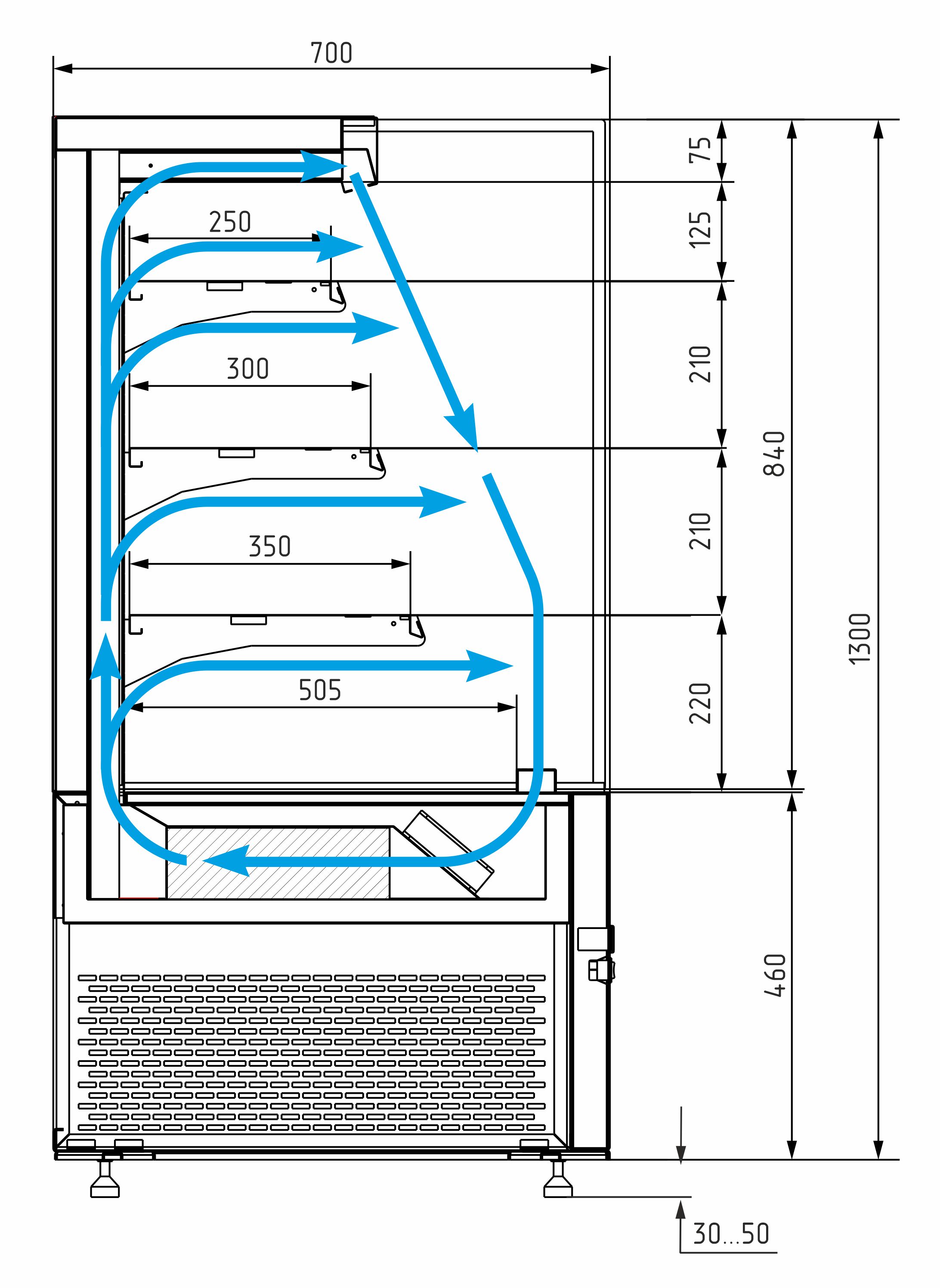 Открытая кондитерская витрина Carboma KC71-130 VV 0,9-2 COSMO используется на предприятиях общественного питания и торговли для демонстрации, охлаждения и кратковременного хранения напитков, тортов, пирожных и других кондитерских изделий и гастрономических товаров. Модель оснащена 3 регулируемыми по уровню металлическими полками со встроенными ценникодержателями и регулируемыми ножками высотой от 30 до 50 мм. Корпус выполнен из стали и пластика, термоизоляция корпуса - из пенополиуретана, остекление - из структурного стеклопакета. Особенности:
