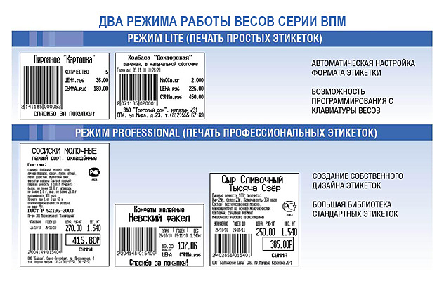 Два режима работы весов Режим Lite (печать простых этикеток)