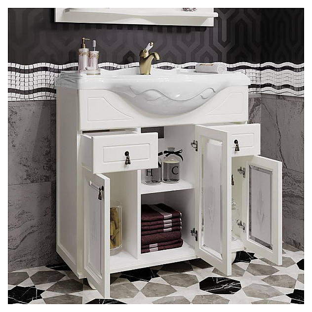 Тумба является частью гарнитура для ванной комнаты Тибет 85 с художественным стеклом, слоновая кость.