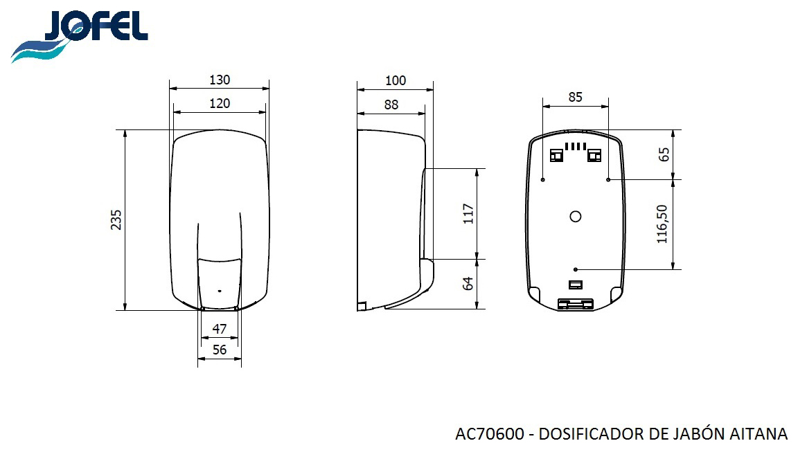 Дозатор Jofel AC70600 серии Aitana используется в туалетных комнатах кафе, баров, ресторанов, торговых центров и офисов. Прибор оснащен эргономичной нажимной кнопкой. Основание, крышка и клапан выполнены из высококачественного ABS-пластика, резервуар - из прозрачного SAN. В комплект поставки входят черный ключ с 2 выступами, 3 дюбеля и 3 винта для крепления на стену. Особенности: