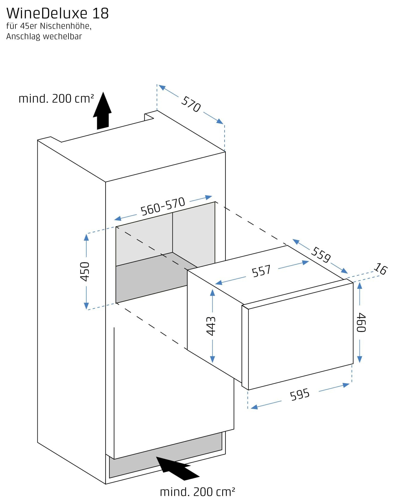 Встраиваемый винный шкаф CASO WineDeluxe E 18 предназначен для охлаждения и длительного хранения бутилированного вина в частных домах, квартирах, отелях и офисах. Модель оснащена сенсорной панелью управления cо светодиодным индикатором температуры и 2 съемными деревянными выдвижными полками с шарикоподшипниками. Дверца выполнена из 3-х слойного стекла с ультрафиолетовым фильтром. Особенности: