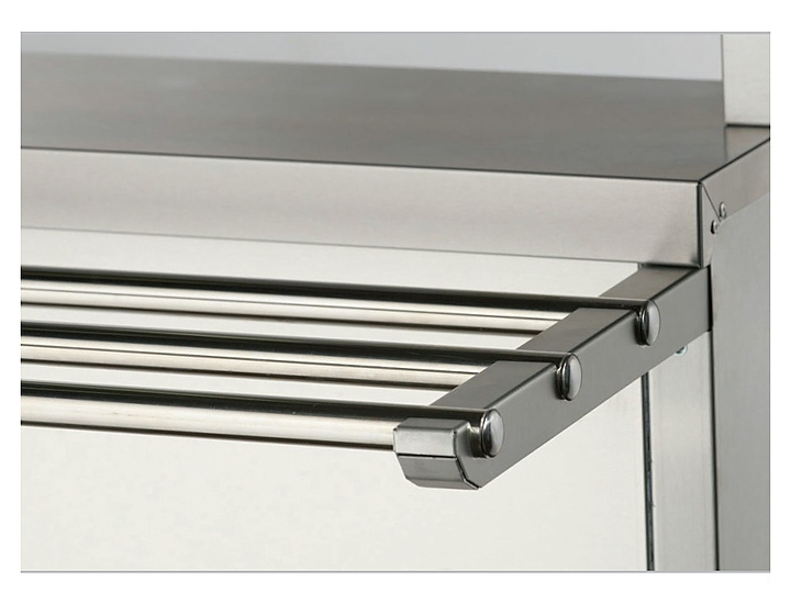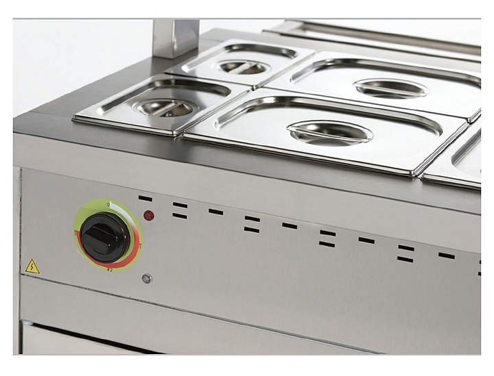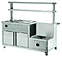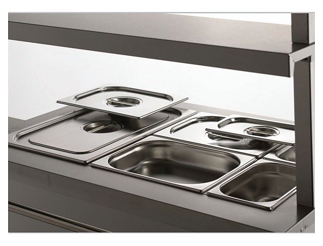 Мармит Gabino MMU-15/7 используется в составе линии раздачи Gabino Riga для демонстрации и кратковременного хранения готовых блюд, продуктов питания, напитков и посуды на предприятиях общественного питания и торговли. Модель оснащена конфоркой, паровой ванной, 2-ярусной полкой с подсветкой, набором гастроёмкостей, нейтральным шкафом с полками и распашными дверцами. Корпус выполнен из нержавеющей стали. Особенности: