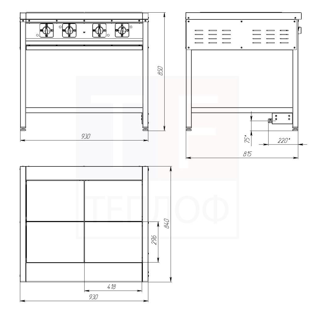 Электрическая плита Теплоф ПЭ-0,48 (Э) предназначена для приготовления различных блюд в наплитной посуде на предприятиях общественного питания и торговли. Модель оснащена энергосберегающими конфорками и ступенчатым регулированием температуры. Сварной каркас выполнен из окрашенной стали, облицовка - из нержавеющей стали. Дополнительные характеристики: