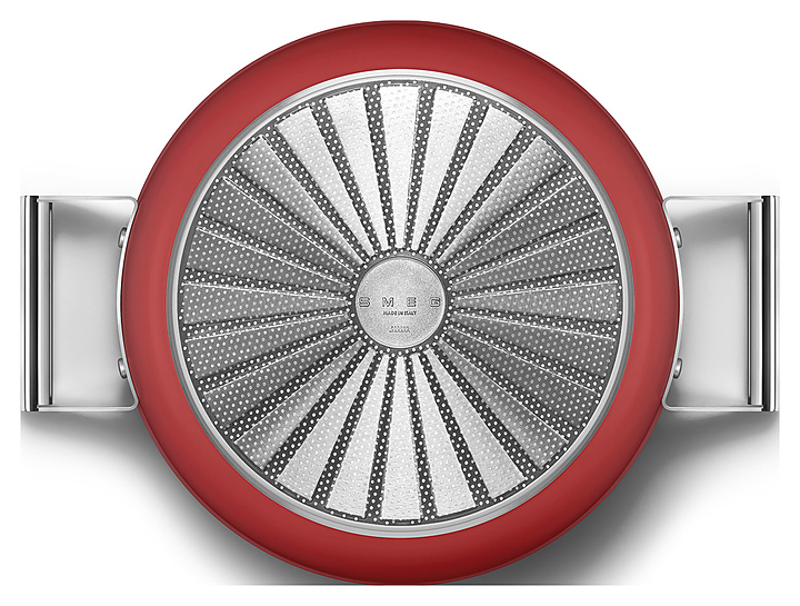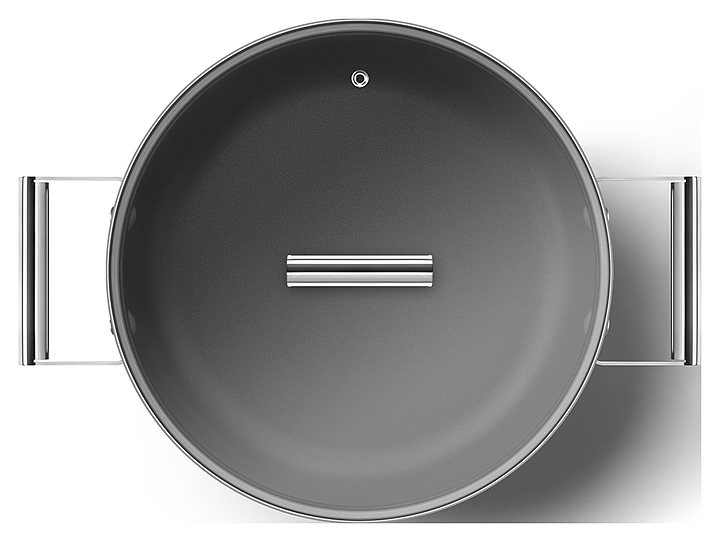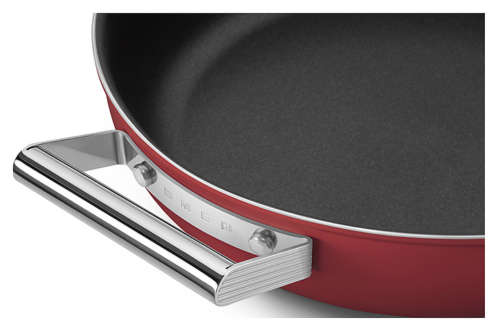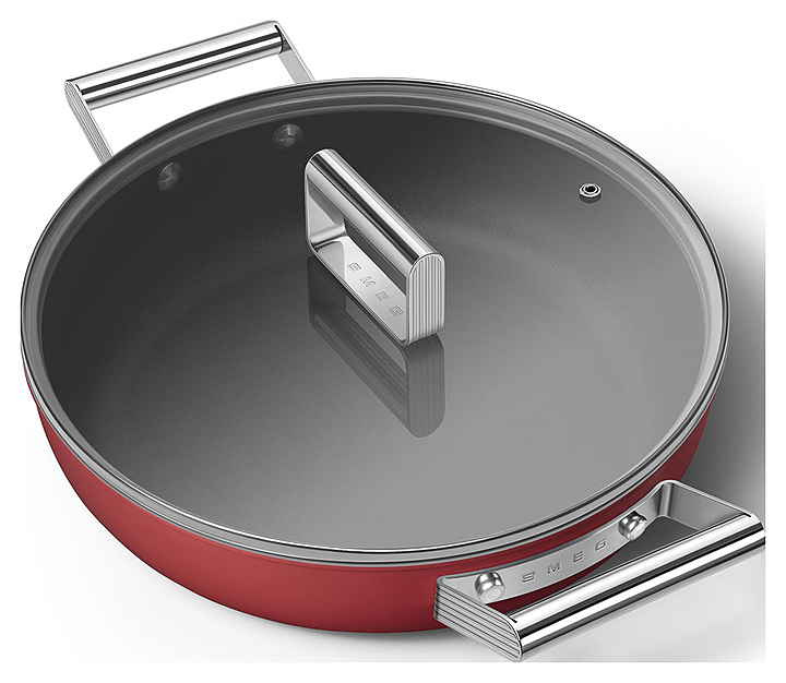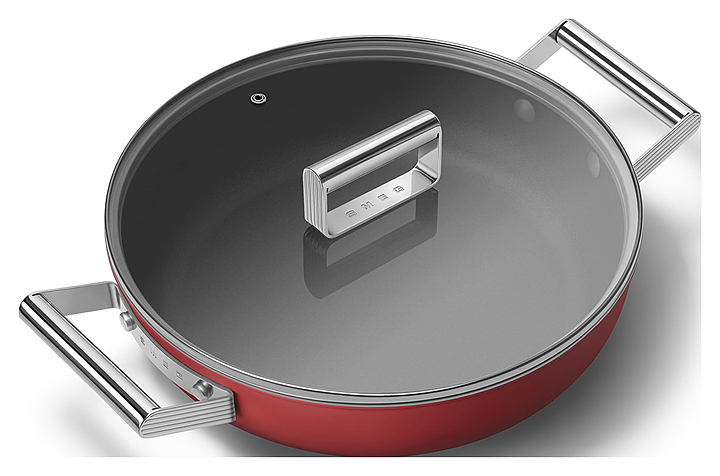 Сковорода SMEG CKFD2811RDM используется на предприятиях общественного питания и частных домах для приготовления широкого спектра блюд. Модель выполнена в стиле 50-х годов. Корпус выполнен из алюминия холодной ковки, дно - из нержавеющей стали с антипригарным покрытием с керамическими частицами, крышка - из закаленного стекла с ободком из нержавеющей стали, ручка крышки и боковые ручки - из полированной нержавеющей стали. Особенности: