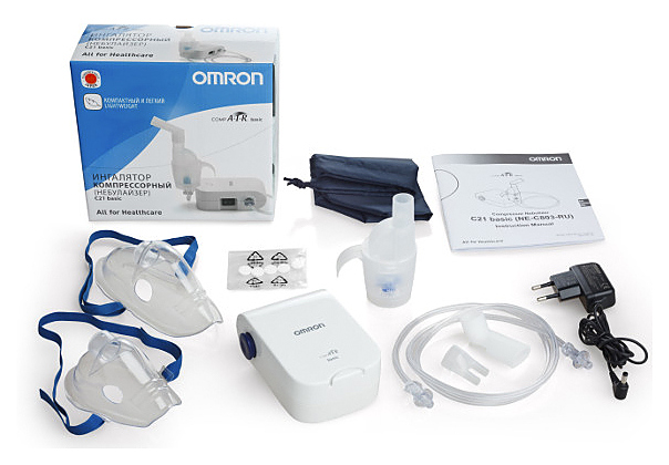 Компрессорный ингалятор (небулайзер) OMRON С21 Basic (NE-C803-RU) используется в домашних условиях для лечения и профилактики острых и хронических заболеваний легких, верхних и нижних дыхательных путей, таких как фарингит, ларингит, риносинусит, трахеит, бронхит, бронхиальная астма, пневмония. В комплект поставки входят нейбулайзерная камера, насадка для верхних дыхательных путей, взрослая и детская маски из ПВХ, 5 запасных воздушных фильтров, загубник, адаптер переменного тока, сумка для хранения, воздуховодная трубка из ПВХ длиной 1 м. Особенности: