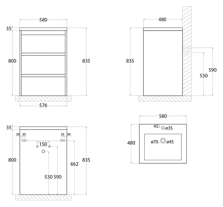 Тумба под раковину Art&Max Family-580-3C-PIA-PE выполнена в современном стиле и прекрасно впишется в интерьер любой ванной комнаты. Напольная конструкция обеспечивает легкий монтаж и не требует специального ремонта в помещении. Модель оснащена тремя выдвижными ящиками с доводчиками. Фасад изделия выполнен из ЛДСП. Тумба может использоваться вместе с раковиной AM-LAV-580-MR-A. Раковина и смеситель в комплект поставки не входят и приобретаются отдельно. Особенности: