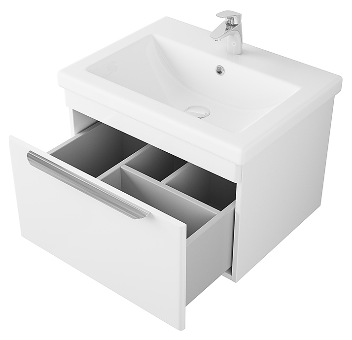 Тумба подвесная под раковину OWL Vind 60 OW23.03.00 выполнена в современном стиле и за счет своего элегантного дизайна легко впишется в любой интерьер. Модель оснащена ящиком полного выдвижения с системой разделения пространства, где удобно хранить необходимые в ванной комнате личные принадлежности, аксессуары и элементы декора. Благодаря подвесной конструкции изделие не занимает много места и обеспечивает легкую уборку в ванной комнате. Корпус тумбы выполнен из ЛДСП, фасады - из высококачественной МДФ белого цвета, ручки - хромированная латунь. Тумба приобретается только в комплекте с раковиной Cersanit COMO 60 UM-COM60/1. Тумба является частью гарнитура для ванной комнаты Vind 60. Особенности: