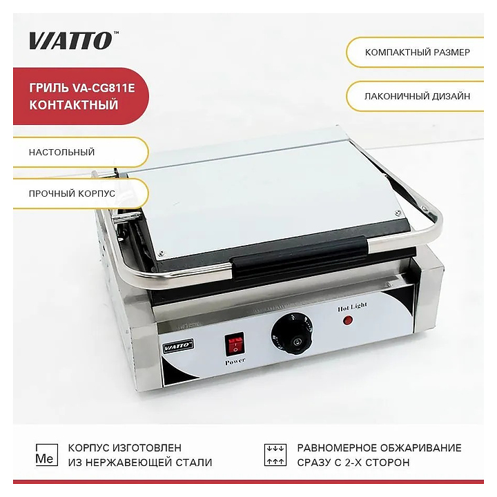 Контактный гриль VIATTO VA-CG811E предназначен для жарки мяса, птицы, рыбы, овощей, а также для приготовления стейков, гамбургеров и горячих сэндвичей на предприятиях общественного питания и торговли. Модель оснащена антипригарным покрытием. Внимание! Информация о товарах, размещенная на сайте, не является публичной офертой, определяемой положениями Части 2 Статьи 437 Гражданского кодекса Российской Федерации. Производители вправе вносить изменения в технические характеристики, внешний вид и комплектацию товаров без предварительного уведомления. Уточняйте характеристики у наших менеджеров перед оформлением заказа. |