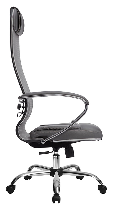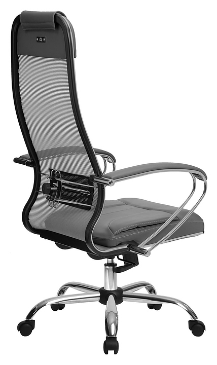Кресло Метта Комплект 5 предназначено для долгой работы за компьютером на даче, дома, а также в офисах. Модель оснащена высокой замкнутой сверху спинкой с мягким накладным подголовником и мягким комфортным объемным сиденьем. Сверхпрочный каркас кресла и регулируемый поясничный подпор изготовлены из стали с износостойким полимерным покрытием черного цвета и хромированным молдингом, обивка спинки – из натяжной сетки без прошивки, обивка сиденья – из износостойкого перфорированного материала NewLeather* без прошивки. Пятилучье в комплект поставки не входит и приобретается отдельно. Особенности: