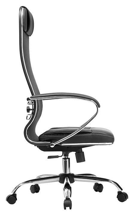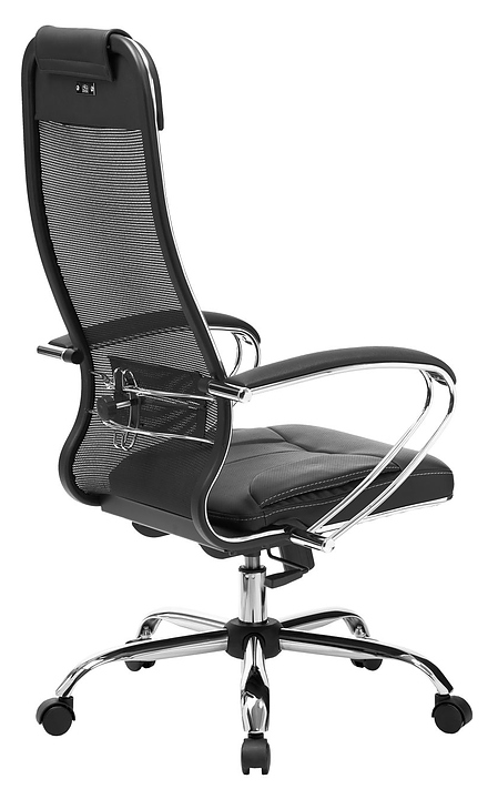 Кресло Метта Комплект 5 предназначено для долгой работы за компьютером на даче, дома, а также в офисах. Модель оснащена высокой замкнутой сверху спинкой с мягким накладным подголовником и мягким комфортным объемным сиденьем. Сверхпрочный каркас кресла и регулируемый поясничный подпор изготовлены из стали с износостойким полимерным покрытием черного цвета и хромированным молдингом, обивка спинки – из натяжной сетки без прошивки, обивка сиденья – из износостойкого перфорированного материала NewLeather* без прошивки. Пятилучье в комплект поставки не входит и приобретается отдельно. Особенности: