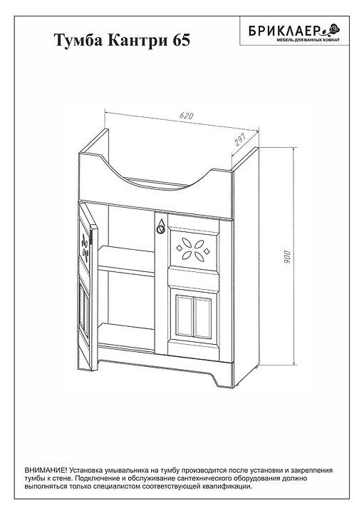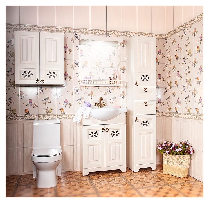 Тумба БРИКЛАЕР Кантри 65 выполнена в стиле прованс. Благодаря декоративной отделке прорезями филёнчатых фасадов мебель станет украшением любой ванной комнаты. Модель оснащена 2 распашными дверцами и внутренней полкой для хранения ванных принадлежностей. Корпус мебели выполнен из влагостойкой ламинированной ДСП, обладающей устойчивыми свойствами к восприятию агрессивной влажной среды ванной комнаты, фасад - из МДФ. Может использоваться в комплекте с раковиной Классик 65. Особенности: