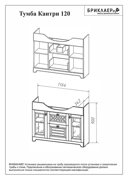 Тумба БРИКЛАЕР Кантри 120 выполнена в стиле прованс. Благодаря декоративной отделке прорезями филёнчатых фасадов мебель станет украшением любой ванной комнаты. Модель оснащена 2 распашными дверцами и 2 отделениями с полками, а также 2 выдвижными ящиками для хранения ванных принадлежностей. Корпус мебели выполнен из влагостойкой ламинированной ДСП, обладающей устойчивыми свойствами к восприятию агрессивной влажной среды ванной комнаты, фасад - из МДФ. Может использоваться в комплекте с раковиной Классик 120. Особенности: