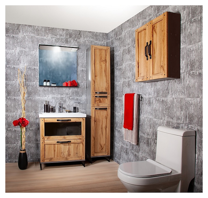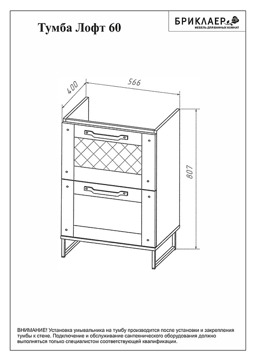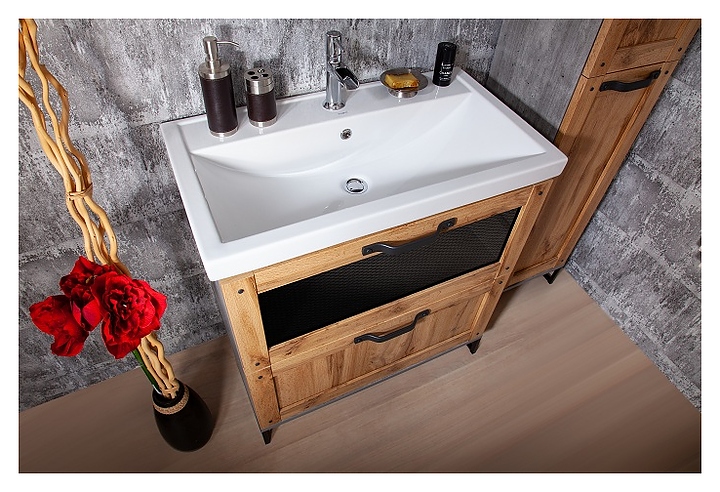 Тумба БРИКЛАЕР Лофт 60 выполнена в эко-стиле и станет украшением любой ванной комнаты. Модель оснащена 2 выдвижными ящиками с шариковыми направляющими для хранения ванных принадлежностей. Корпус мебели выполнен из влагостойкой ламинированной ДСП, обладающей устойчивыми свойствами к восприятию агрессивной влажной среды ванной комнаты, фасад - из МДФ, фурнитура - из матового черного металла. Может использоваться в комплекте с раковиной Фостер 60. Особенности: