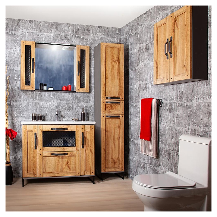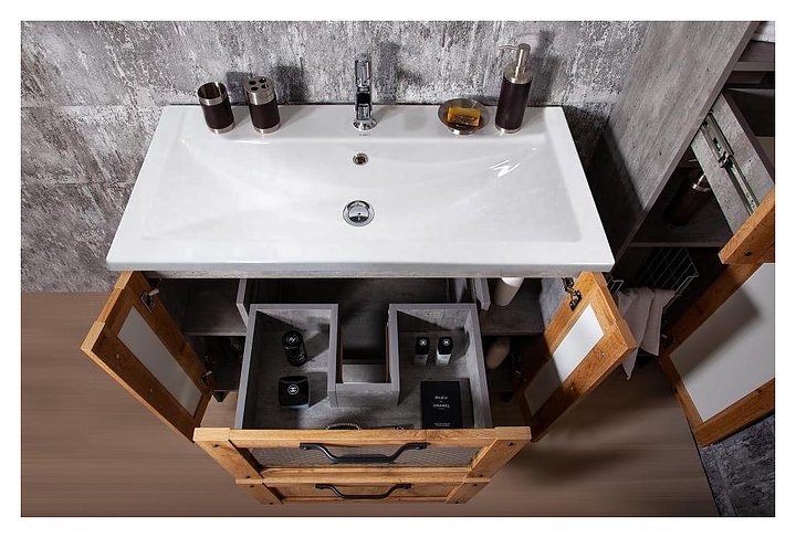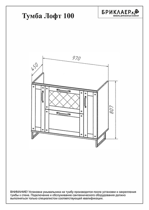 Тумба БРИКЛАЕР Лофт 100 выполнена в эко-стиле и станет украшением любой ванной комнаты. Модель оснащена 2 выдвижными ящиками с шариковыми направляющими и 2 распашными дверями с отделениями для хранения ванных принадлежностей. Корпус мебели выполнен из влагостойкой ламинированной ДСП, обладающей устойчивыми свойствами к восприятию агрессивной влажной среды ванной комнаты, фасад - из МДФ, фурнитура - из матового черного металла. Может использоваться в комплекте с раковиной Фостер 100 или Mario 100. Особенности: