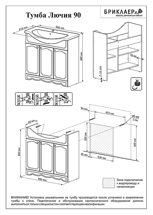 Тумба БРИКЛАЕР Лючия 90 выполнена в классическом стиле. Благодаря изящной отделке и элегантному дизайну мебель станет украшением любой ванной комнаты. Модель оснащена 3 распашными дверцами с отделениями для хранения ванных принадлежностей. Корпус и фасад мебели выполнены из МДФ с покрытием из глянцевого ПВХ, фурнитура - из латуни.