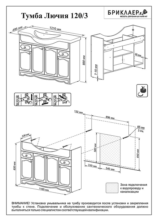 Тумба БРИКЛАЕР Лючия 120 выполнена в классическом стиле. Благодаря изящной отделке и элегантному дизайну мебель станет украшением любой ванной комнаты. Модель оснащена 4 распашными дверцами с просторными отделениями для хранения ванных принадлежностей, а также 2 выдвижными ящиками. Корпус и фасад мебели выполнены из МДФ с покрытием из глянцевого ПВХ, фурнитура - из латуни. Может использоваться в комплекте с раковиной Классик 120. Особенности: