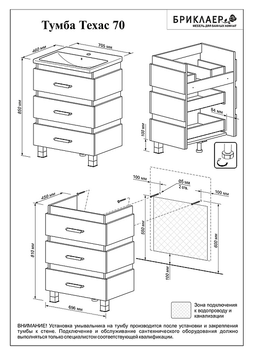 Тумба БРИКЛАЕР Техас 70 выполнена в современном эко-стиле. Благодаря простоте и функциональности мебель станет украшением любой ванной комнаты. Модель оснащена 3 вместительными выдвижными ящиками для хранения ванных принадлежностей. Корпус и фасад мебели выполнены из влагостойкой ЛДСП, ручки и ножки - из хромированного металла. Может использоваться в комплекте с раковиной Фостер 70 и Комо 70. В комплект поставки входят 3 пластиковые ручки и 3 пластиковые опоры (декоративные спереди и поддерживающие сзади). Особенности: