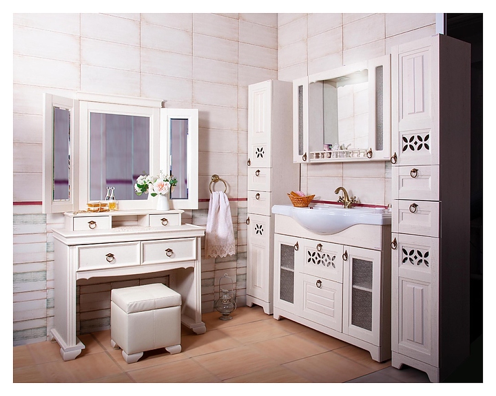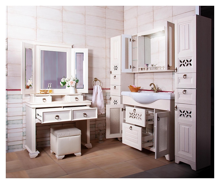 Тумба БРИКЛАЕР Кантри выполнена в стиле прованс. Благодаря декоративной отделке прорезями филёнчатых фасадов мебель станет украшением любой ванной комнаты. Модель оснащена столешницей, 2 выдвижными ящиками сверху без направляющих и 2 выдвижными ящиками на шариковых направляющих под столешницей. Корпус мебели выполнен из влагостойкой ламинированной ДСП, обладающей устойчивыми свойствами к восприятию агрессивной влажной среды ванной комнаты, фасад - из МДФ. В комплект поставки входят шариковые направляющие и 4 металлических ручки. Особенности:
