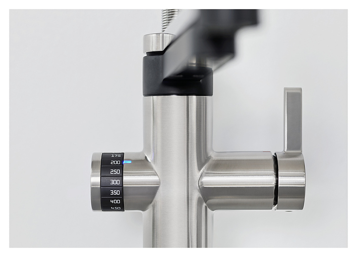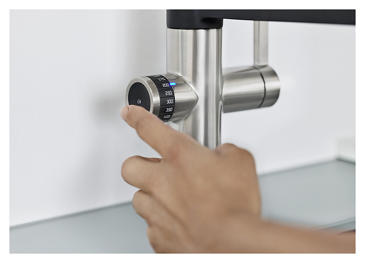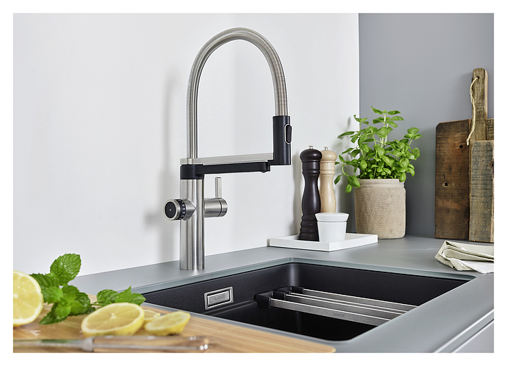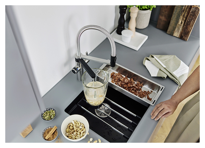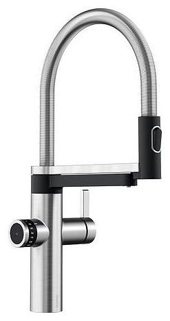 Смеситель Blanco Evol-S Pro Filter 526276 предназначен для использования на кухне для подачи горячей и холодной воды. Модель оснащена удобным рычагом с функцией мерного стакана, высоким поворотным, выдвижным изливом, отдельным выходом для фильтрованной питьевой воды и керамическим картриджем. Однорычажный тип управления позволяет очень быстро и плавно регулировать подачу воды одной рукой. Изделие выполнено из высококачественной латуни, которая отличается прочностью, долговечностью и устойчивостью к перепадам температур, шланг выдвижного излива в металлической оплетке. Функция мерного стакана: с помощью поворотной шкалы можно задать необходимый объем воды, после чего нажать сенсорную кнопку сбоку, и смеситель подаст нужное количество воды, регулируя при этом мощность напора в зависимости от выбранного объема: чем больше желаемое количество воды, тем сильнее струя и быстрее поток воды. Особенности: