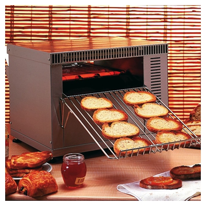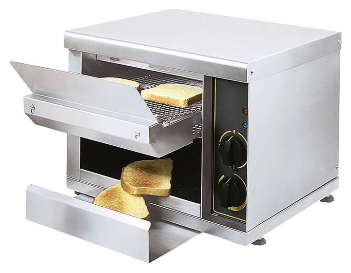 Тостер Roller Grill CT-540 предназначен для подогрева и поджарки кусочков хлеба на предприятиях общественного питания и торговли. Задняя панель тостера снимается, что позволяет направлять выход готового продукта на тыльную сторону, используя приемную решетку. Задняя приемная решетка, загрузочный и приемный фронтальные поддоны снимаются для легкой очистки. Корпус выполнен из нержавеющей стали. Особенности: