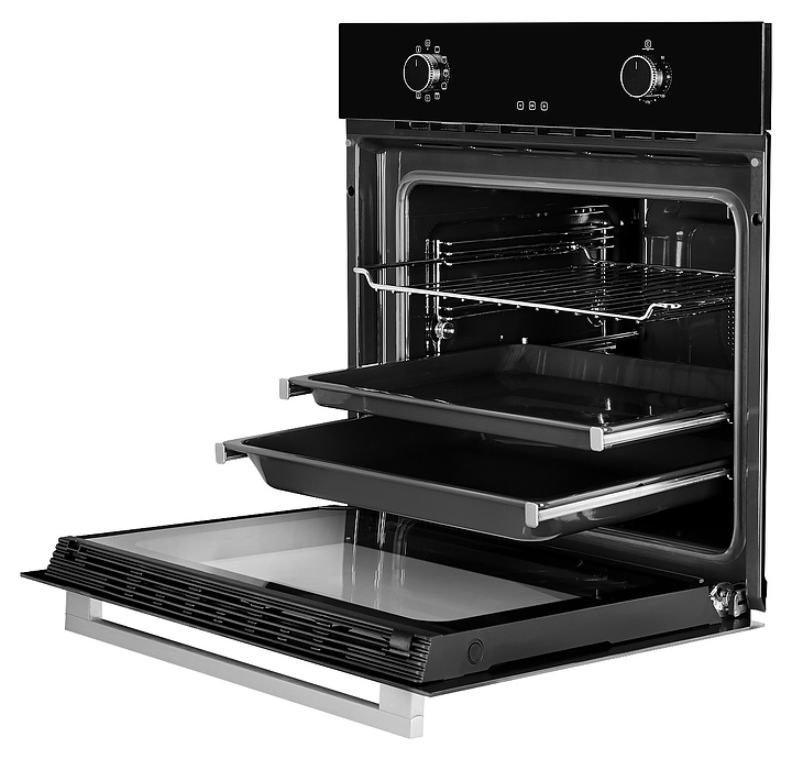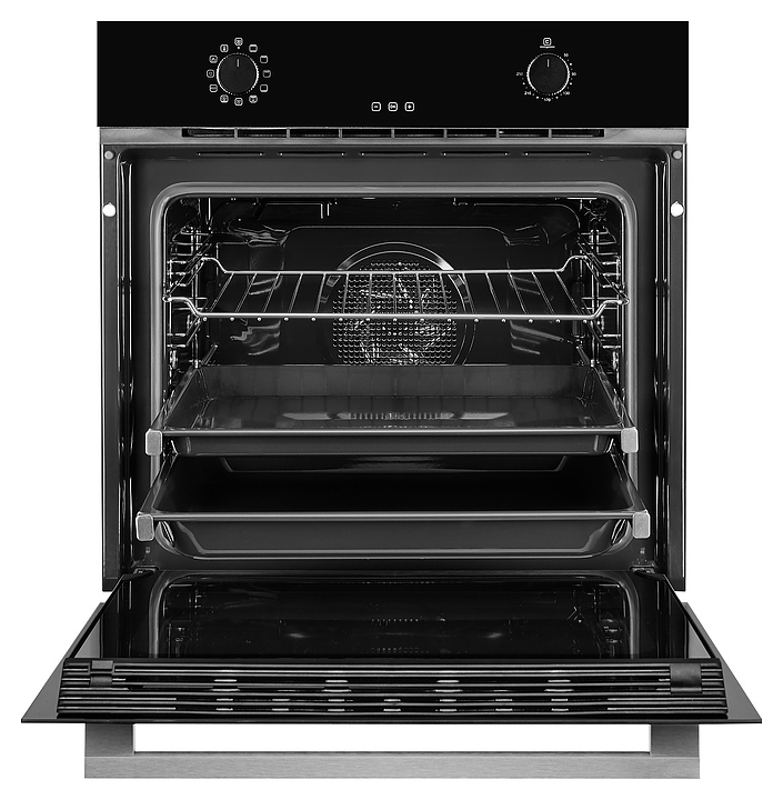 Электрический духовой шкаф Kuppersberg FH 611 B предназначен для приготовления большого ассортимента блюд в домашних условиях. Модель оснащена расположенным в задней стенке вентилятором, вместительной камерой, 2 съемными стойками с 5 уровнями направляющих для противней, герметичной дверью со смотровым окном, горизонтальной рукояткой, 2 цилиндрическими поворотными регуляторами, сенсорной панелью управления со светодиодным цифровым дисплеем и индикацией белого цвета. Корпус выполнен из высококачественной стали с полным остеклением фронтальных панелей без винтового крепежа, направляющие с хромированным покрытием. В комплект поставки входят 2 противня с антипригарным покрытием ProCook: стандартный и глубокий со сточным желобом для жира, решетка для гриля с возможностью установки в глубокий противень. Особенности: