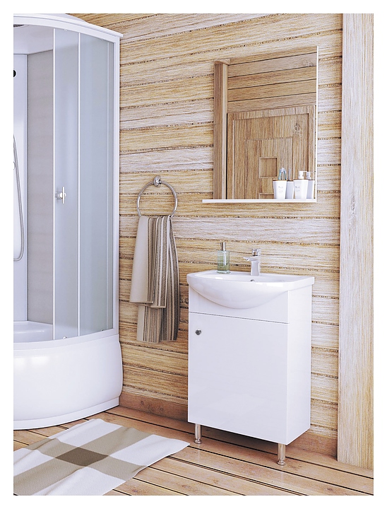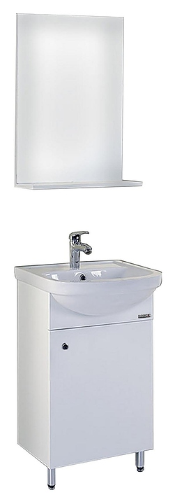 Гарнитур Grossman ЭКО-52 дополнит интерьер ванной комнаты. В комплект входят тумба под раковину, раковина Santeri Акватон-52 и зеркало. Тумба оснащена распашной дверцей и ножками, зеркало - полочкой. Раковина имеет слив-перелив и одно отверстие для смесителя, расположенное по центру. Мебель выполнена из ЛДСП и покрыта краской, устойчивой к механическим воздействиям, перепадам температур и высокой влажности. В комплект поставки входят хромированная ручка, 2 декоративных хромированных и 1 пластиковая ножки. Дополнительные характеристики: