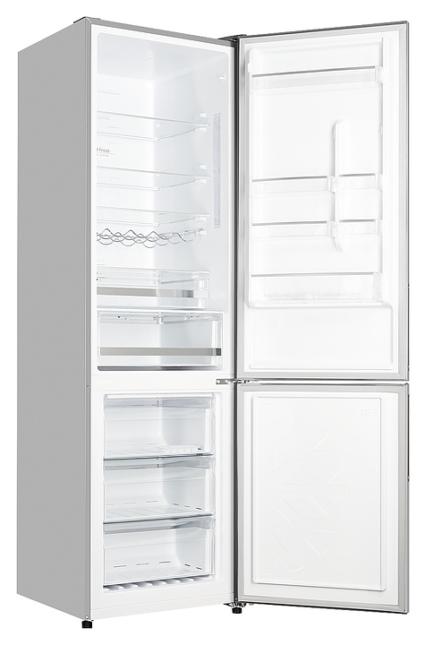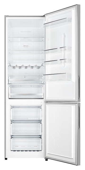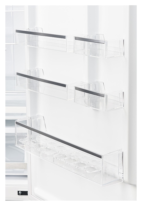В комплект поставки входят 4 плоские полки, винная полка, 6 дверных полок, включая 2 подставки для 6 яиц, 2 ящика для овощей и фруктов, 3 ящика для морозильной камеры и форма для льда.