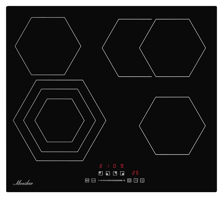 Электрическая варочная панель Monsher MHE 6019 предназначена для приготовления большого ассортимента блюд на предприятих общественного питания и в домашних условиях. Модель оснащена 4 варочными зонами в форме сот различного размера, сенсорной панелью управления и 5 цифровыми дисплеями с индикацией красного цвета. Поверхность выполнена из высококачественной стеклокерамики с прямой кромкой. Особенности: