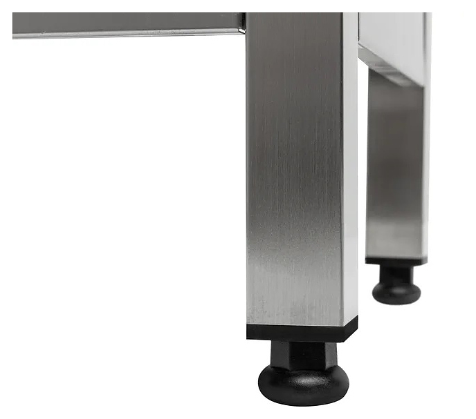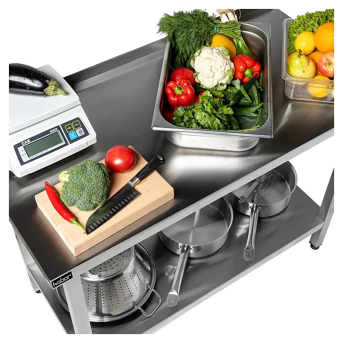 Производственный стол Koбор СПБ-70/70/430 используется на предприятиях общественного питания и торговли для разделывания и обработки пищевых продуктов, а также в качестве вспомогательной поверхности для кухонного оборудования. Каркас выполнен из уголка нержавеющей стали, столешница и полка - из нержавеющей стали AISI 430, столешница укреплена листом ламинированной древесностружечной плиты с внутренней стороны.