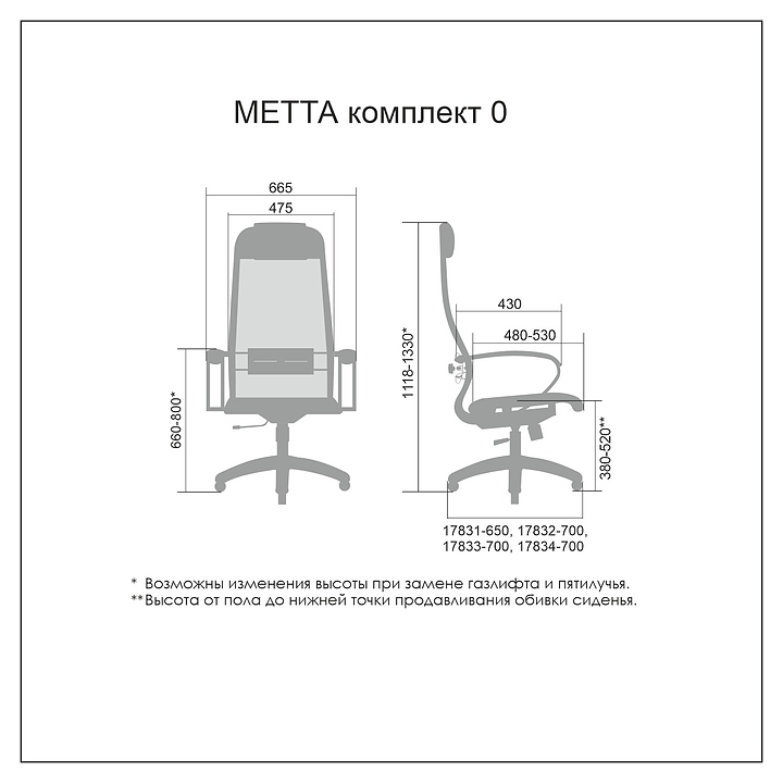 Кресло Метта Комплект 0 предназначено для долгой работы за компьютером на даче, дома, а также в офисах. Модель оснащена высокой, замкнутой сверху спинкой с мягким накладным подголовником и комфотным сиденьем. Сверхпрочный каркас спинки и подлокотников и регулируемый поясничный подпор изготовлены из стали с полимерным покрытием, обивка сиденья - из износостойкой обивочной сетчатой ткани, обивка спинки - из мягкой сетки. Пятилучье в комплект поставки не входит и приобретается отдельно. Особенности: