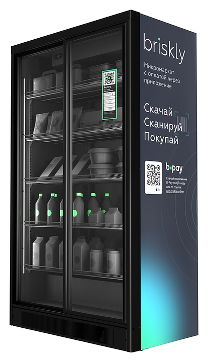 Микромаркет Briskly M11 Slide предназначен для размещения, охдаждения, демонстрации и бесконтактной продажи продуктов, свежих готовых блюд, комплексных обедов, снеков, напитков и непродовольственных товаров в офисах, бизнес-центрах, спортивных клубах, учебных и административных учреждениях, вокзалах и аэропортах. Модель оснащена умным модулем, электронным замком, датчиками температуры и камерой наблюдения с обзором 120°. Корпус выполнен из окрашенного металла, полки - из металлической решетки, дверная рама - из алюминиевого профиля. Для возможности оплаты банковской картой (без приложения) необходимо приобрести терминал бесконтактной оплаты. Механизм работы: