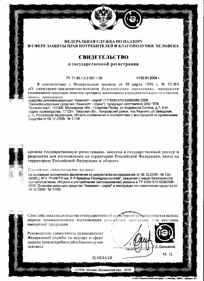Дезинфицирующее средство Техноэкспорт Авансепт, спрей, 500 мл, используется в медицинских и лечебно-профилактических организациях различного профиля, на предприятиях общественного питания и торговли, в учреждениях социального обеспечения, образования, культуры, спорта и отдыха, в офисах, на объектах коммунально-бытовых служб, в быту для дезинфекции небольших по площади поверхностей в помещениях, в том числе поверхностей медицинских приборов и оборудования, резиновых и пластиковых ковриков, телефонных аппаратов, мониторов, компьютерных клавиатур, мышек. Средство представляет собой прозрачную жидкость от бесцветного до светло-желтого цвета со слабым характерным запахом спирта и применяемой отдушки. Поставляется в виде спрея-распылителя. Минимальный размер заказа - 14 штук, цена указана за 1 шт. Особенности: