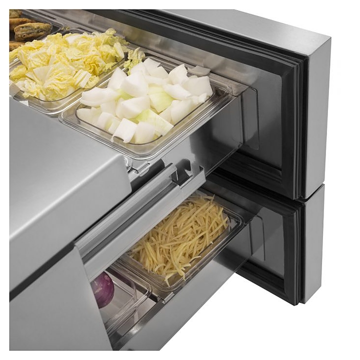 Шеф-база Turbo air TCBE-48SDR-N предназначена для обработки, охлаждения, заморозки и длительного хранения пищевых продуктов на предприятиях общественного питания и торговли. Модель оснащена столешницей, 2 ящиками и 4 колесами. Корпус, столешница и ящики выполнены из нержавеющей стали, изоляция - из полиуретана высокой плотности. Гастроемкости в комплект поставки не входят и приобретаются отдельно. Особенности:
