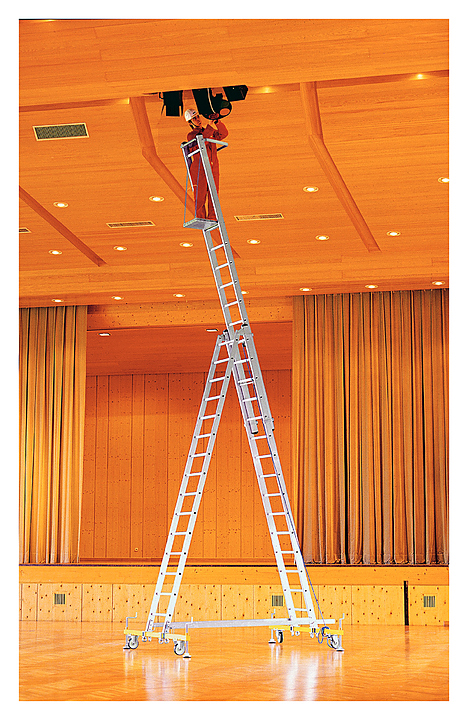 Монтажная лестница ZARGES 41342 используется для работ на высоте. Модель оснащена рифлеными ступенями, большой рабочей площадкой для стояния, автоматическими запирающими замками, направляющими кронштейнами с пластиковыми прокладками, страховочным ограждением и вместительным лотком для инструмента. Изделие выполнено из профиля прямоугольного сечения, ролики - из полиамида. Особенности: