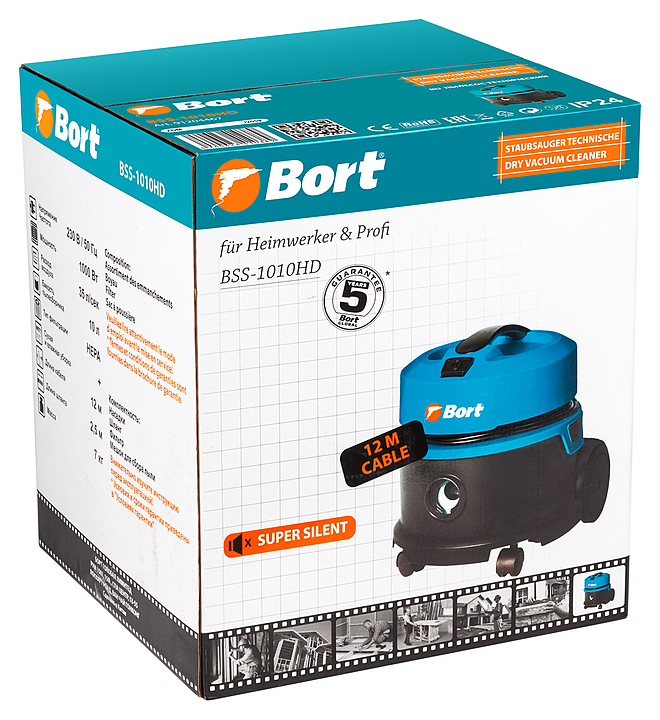 Пылесос Bort BSS-1010HD предназначен для обработки различных напольных покрытий в частных домах, квартирах, отелях, офисах, детских садах и больницах. Модель оснащена гибким всасывающим шлангом, патронным НЕРА фильтром и колесами. Корпус и все аксессуары выполнены из ударопрочного пластика, устойчивого к механическим повреждениям и агрессивной среде. Комплектация: