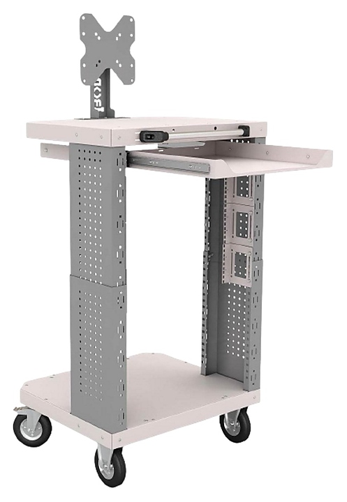 Рабочее место ДВК COMTEX №4 предназначено для обустройства офисов, серверных, производственных участков, станций технического обслуживания и диагностики автомобилей, оснащенных компьютерами и оргтехникой. Модель оснащена выдвижной полкой, кронштейнами и удобной ручкой для перемещения. Колеса выполнены из полиуретана. Комплектация: