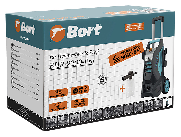 Мойка высокого давления Bort BHR-2200-Pro предназначена для очистки от грязи и пыли различных поверхностей на даче, в саду и в гараже. Модель оснащена напорным шлангом, фильтром, пистолетом-распылителем, пеногенератором, большими колесами и складной ручкой. Корпус насоса выполнен из силумина. Особенности: