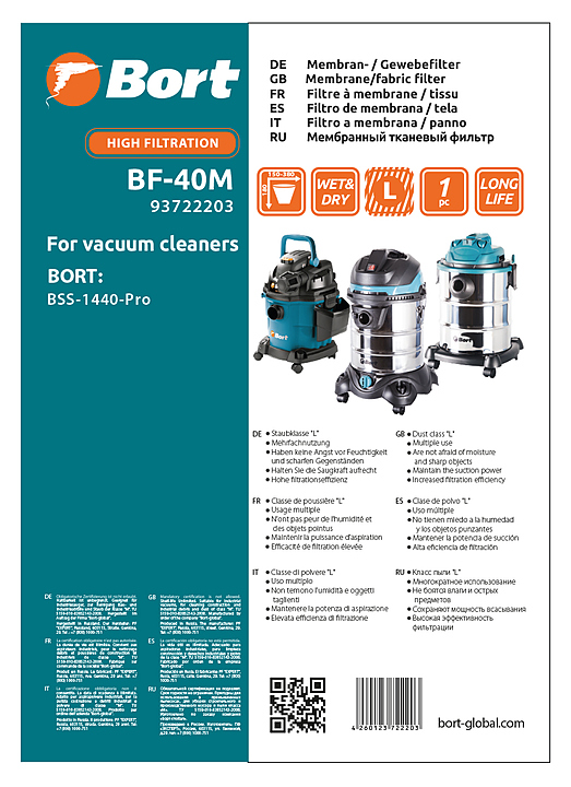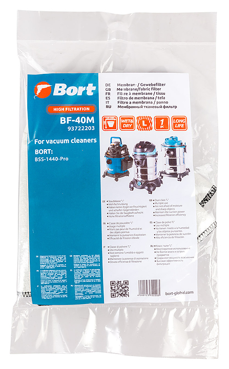 Тканевый фильтр Bort BF-40M используется совместно с пылесосами BSS-1440-Pro. Изделие выполнено из плотного фильтрующего материала и предназначено для многократного применения. Характеристики: